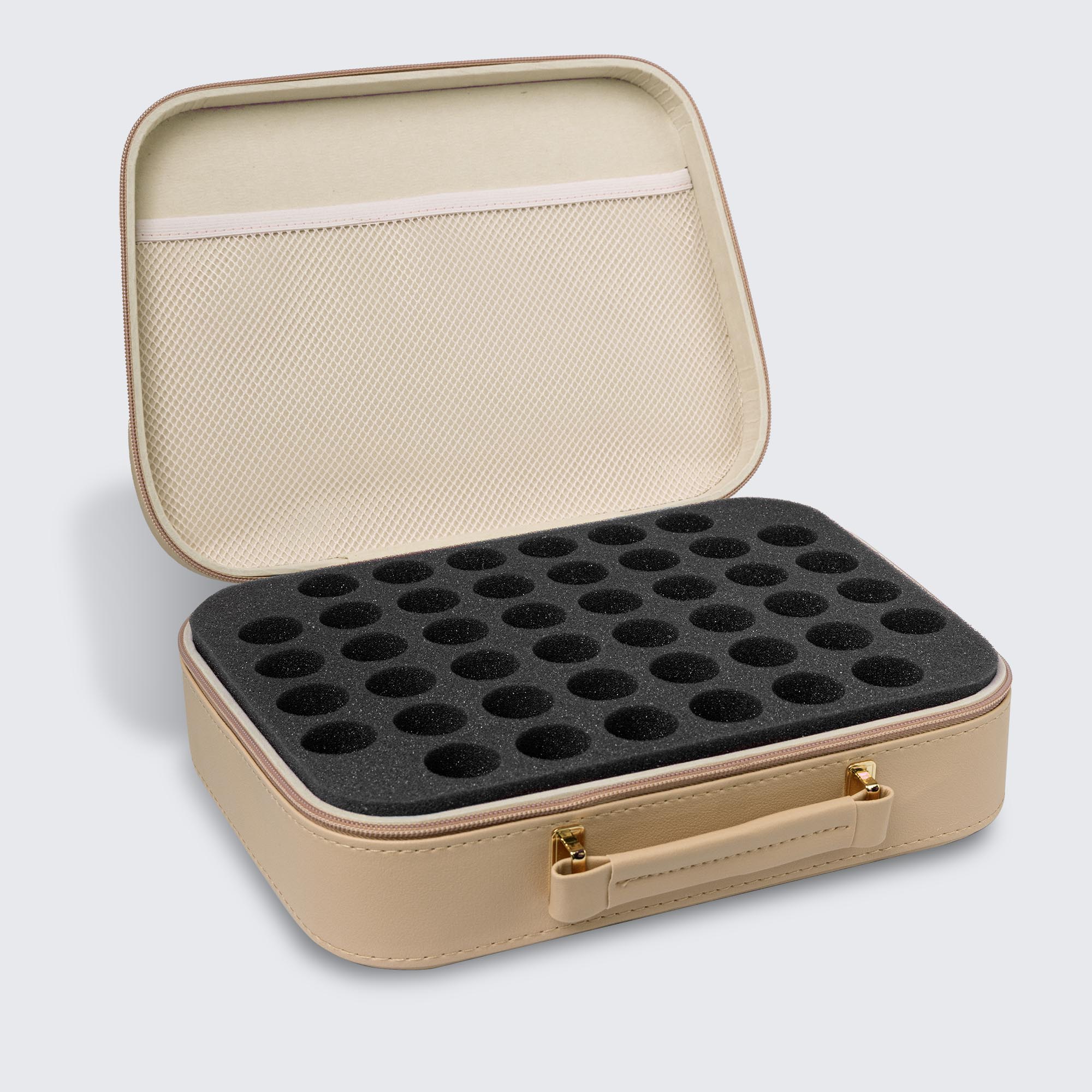 Large foam insert holds up to 44 polish bottles.